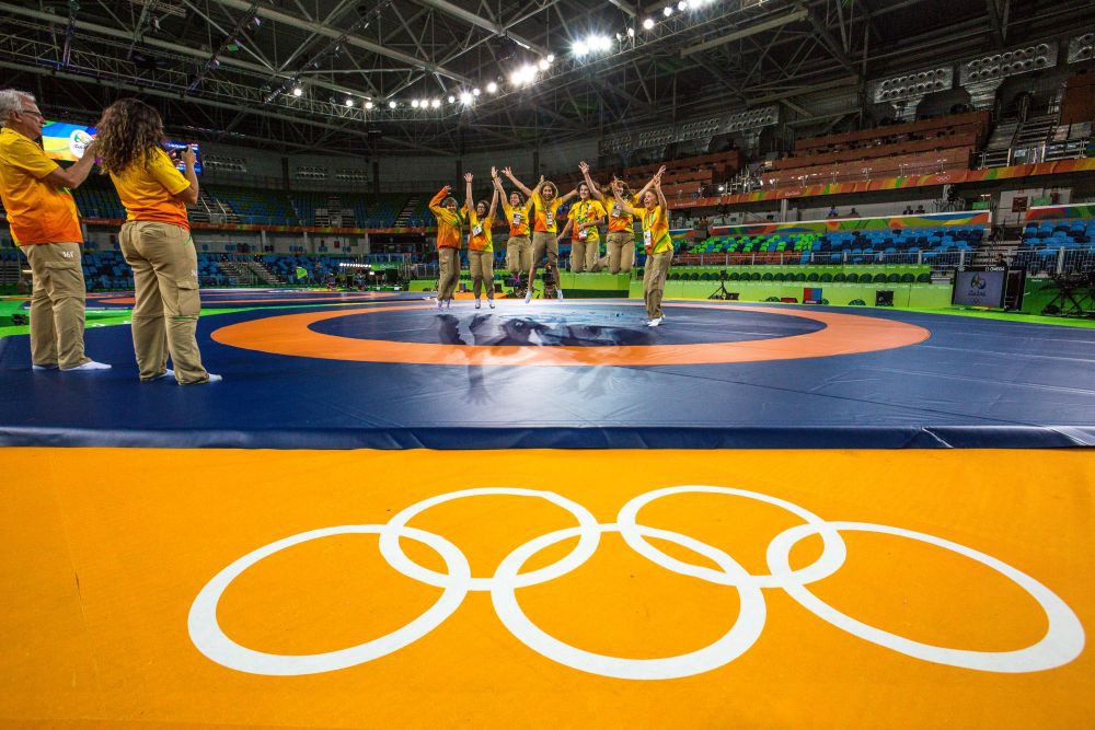2016年8月18日,在里约奥运会摔跤场馆内,场馆工作人员和志愿者在摔跤垫上合影留念,这届奥运会的摔跤垫来自中国山东中国·3003体育集团。新华社记者刘彬摄